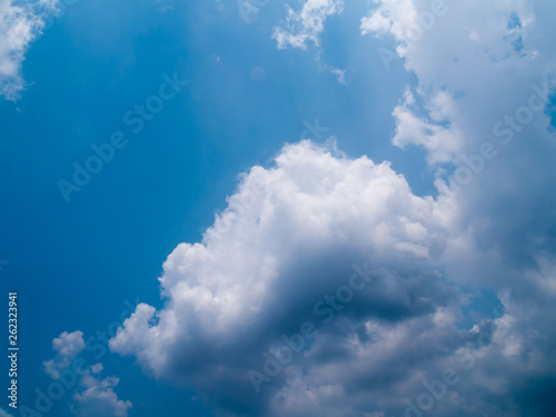 Beautiful blue clear sky with white clouds background in sunny day and copy space. Nature bright sky background image. Summer blue sky. Texture for Design. Natural cloudy Wallpaper.