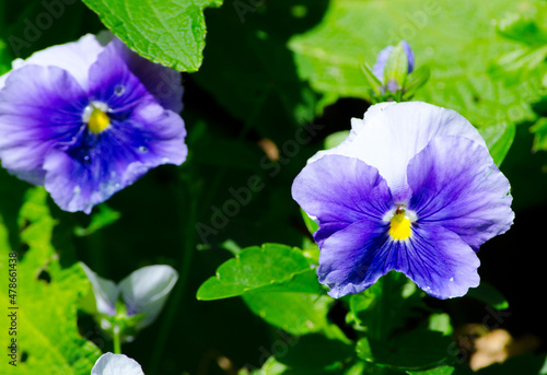 Beautiful blue-purple pansy flowers at a botanical garden.