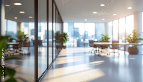 Beautiful blurred background of a light modern office interior with panoramic windows and beautiful lighting