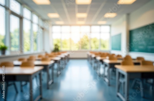 Beautiful blurred background of bright classroom and office with panoramic windows and beautiful lighting. Blurred empty school background.