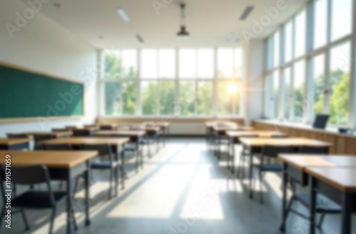 Beautiful blurred background of bright classroom and study room with panoramic windows and beautiful lighting. Blurred Empty school background