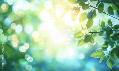 Beautiful blurred spring background with bokeh, green and blue colors, blurred nature, spring light background with sun rays and defocused elements
