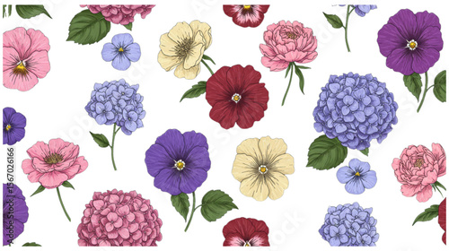 Beautiful botanical arrangement features a delightful mix of garden flowers including hydrangeas, pansies, and peonies for creative floral projects.