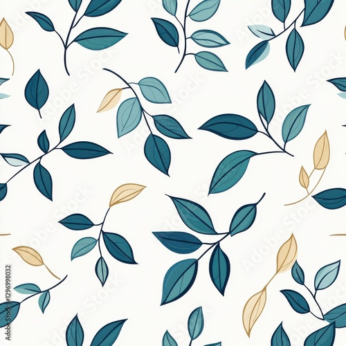 Beautiful botanical pattern featuring teal and golden leaves on a soft cream background.