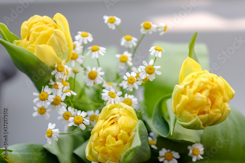 Beautiful bouquet of flowers: yellow tulip, daffodils, chamomile. colorful spring flowers background. Blooming flowers concept. Happy mother's day