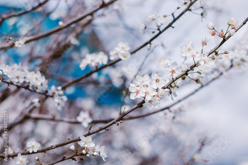 Beautiful branch with white blossom in a spring garden.