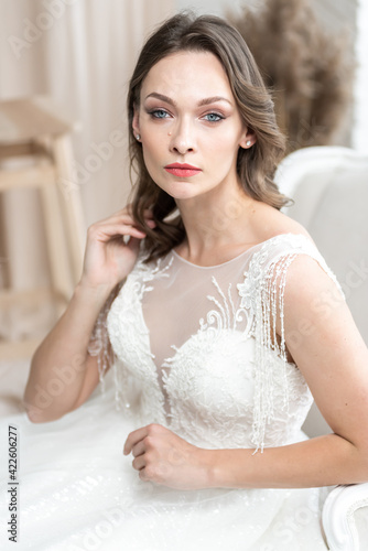 Beautiful bride in a beautiful wedding dress poses on the background of a hotel room