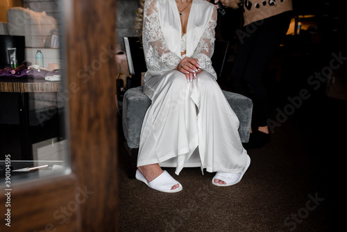 Beautiful bride in a peignoir. Morning of wedding day. legs and hands bride in a boudoir robe