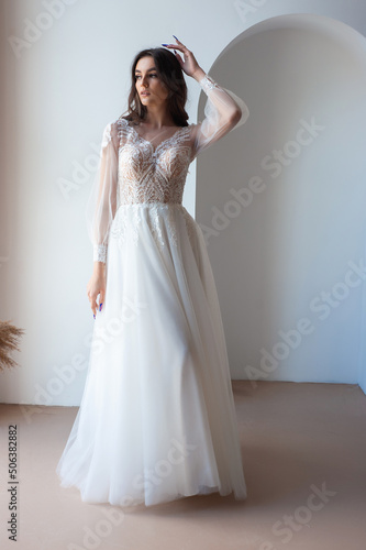 Beautiful bride perfect style. Wedding hairstyle make-up luxury wedding dress