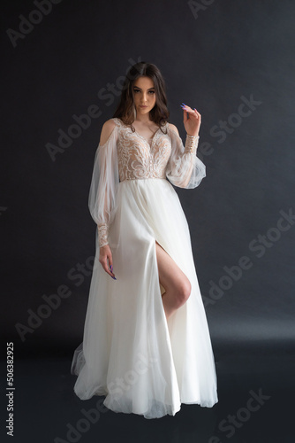 Beautiful bride perfect style. Wedding hairstyle make-up luxury wedding dress