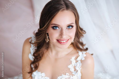 Beautiful bride with long curly hair in elegant wedding dress and diadem smiling in room in the wedding morning
