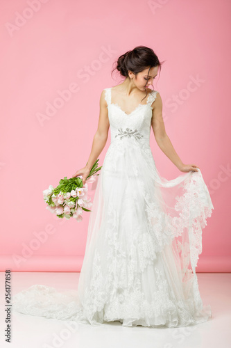 beautiful bride with wedding bouquet of pink tulips on pink background