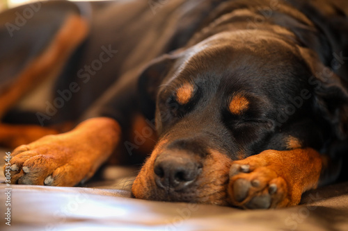 Beautiful brown and tan female rottweiler dog sleeping on leather lounge