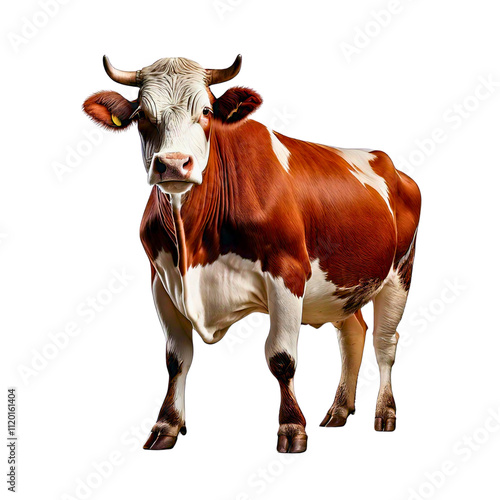 Beautiful brown and white dairy cow standing in a farm setting under bright sunlight during the day