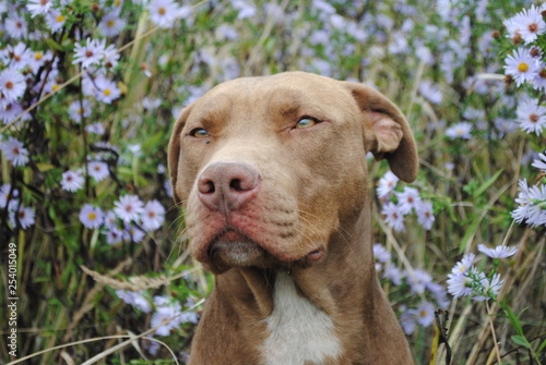 Beautiful brown dog in a flower field