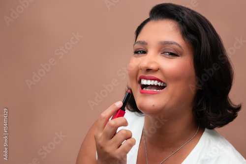 Beautiful brown skin woman laughing and applying red lipstick. Perfect for cosmetics, make-up, beauty, self-care, self-love. Ample copy space on beige background.