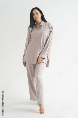 beautiful brunette adult girl in femine pajamas sleep wear homewear on white background