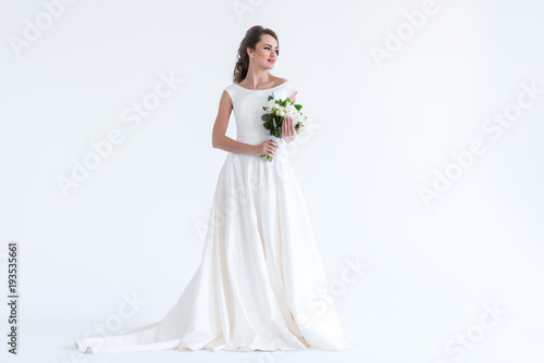 beautiful brunette bride posing in white dress with wedding bouquet, isolated on white