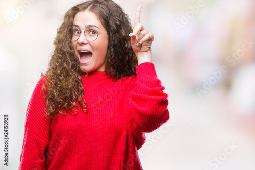 Beautiful brunette curly hair young girl wearing glasses and winter sweater over isolated background pointing finger up with successful idea. Exited and happy. Number one.