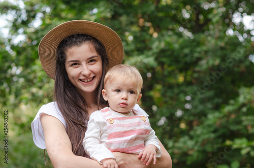 Beautiful brunette female in straw hat jeans, white t-shirt and a small backpack with his little cute child daughter playing together in a park