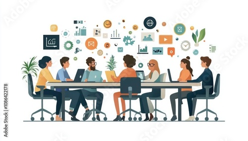 Beautiful business people use gadgets, talk and smile during a conference in the office surrounded by icons.