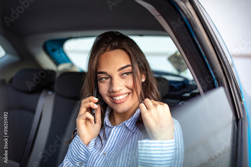 Beautiful business woman is using a smart phone and smiling while sitting on back seat in the car. Portrait of beautiful smiling happy woman in back of a car. Beautiful business woman in car.