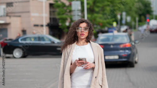 Beautiful business woman portrait in summer in the city with a phone in her hands