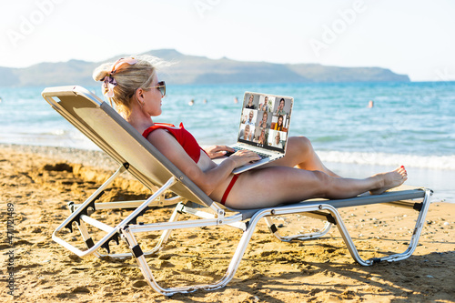 Beautiful Business Woman Working Online On Laptop Computer While Lying On Beach Lounger. Freelancer Girl Relaxing And Using Notebook Internet Work. Communication Technology.