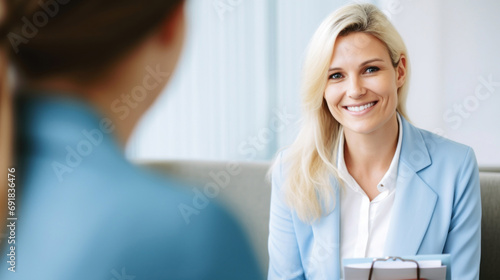 Beautiful businesswoman talking with her colleague in office. Business and office concept.