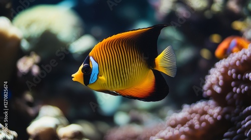 Beautiful butterfly fish swimming among colorful coral in a vibrant underwater ecosystem
