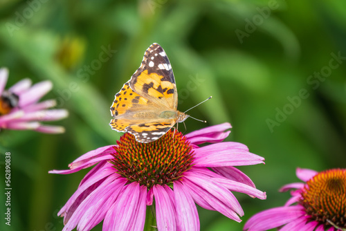 Beautiful butterfly painted lady or Vanessa cardui sitting on purple Echinacea flower in the summer. Close up. Macro.