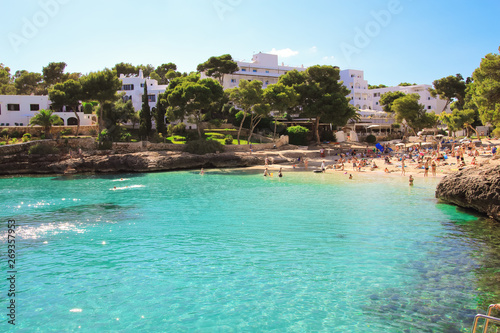 Beautiful Cala d'Or Beach in sunny summer day with turquoise water. Beach Cala Gran in Cala d'Or, Mallorca, Spain.