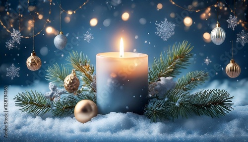 beautiful candle on christmas background with fir tree branches, garland and beautiful bokeh