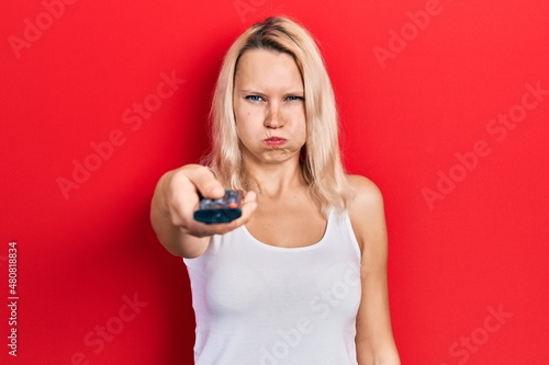 Beautiful caucasian blonde woman holding television remote control puffing cheeks with funny face. mouth inflated with air, catching air.