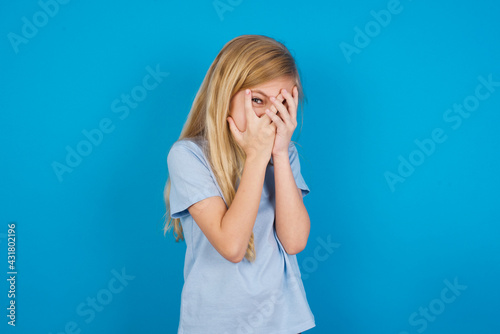 beautiful Caucasian little girl wearing blue T-shirt over blue background covering face with hands and peering out with one eye between fingers. Scared from something or someone.