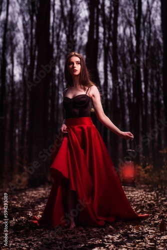 Beautiful Caucasian woman in black and red dress in mysterious autumn forest with fallen dry leaves
