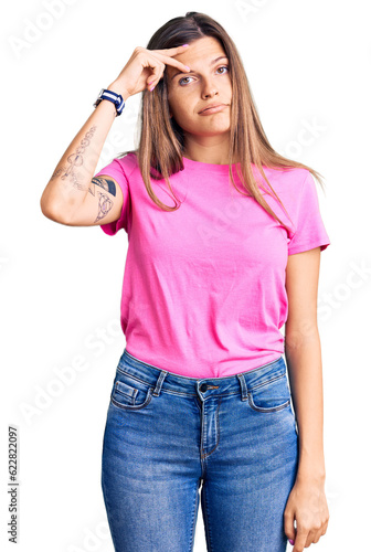 Beautiful caucasian woman wearing casual clothes worried and stressed about a problem with hand on forehead, nervous and anxious for crisis