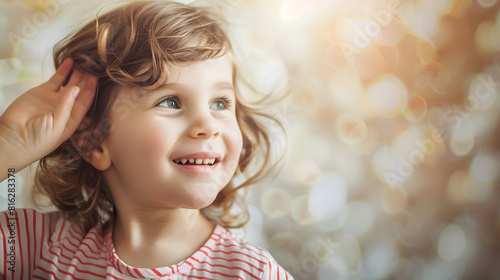 Beautiful child girl wearing casual clothes smiling with hand over ear listening and hearing to rumor or gossip deafness concept : Generative AI