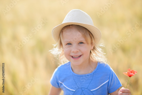 Beautiful child in a field of rye at sunset. A child in amazing clothes walking through the field of rye.