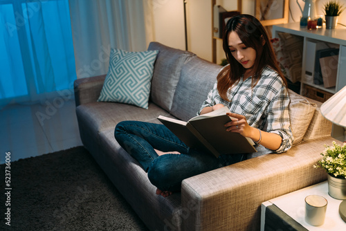 beautiful chinese lady sitting comfortably on the couch is holding and reading a book alone on a peaceful night in a cozy home living room interior.