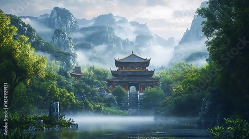 Beautiful chinese temple in a peaceful natural setting with misty mountains picture