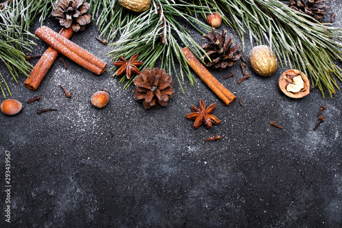 Beautiful Christmas Background with copy space for your text. Pine branch, cones, cinnamon, nuts covered with snow