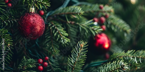 Beautiful Christmas Background with green fir tree brunch and red glittery toy close up. Copy space