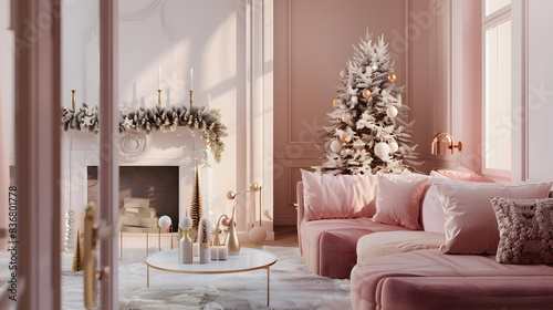 Beautiful Christmas interior with fireplace, Christmas tree and interior elements. AI Generated