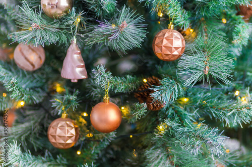 Beautiful Christmas tree decorated with colorful toys and garlands.