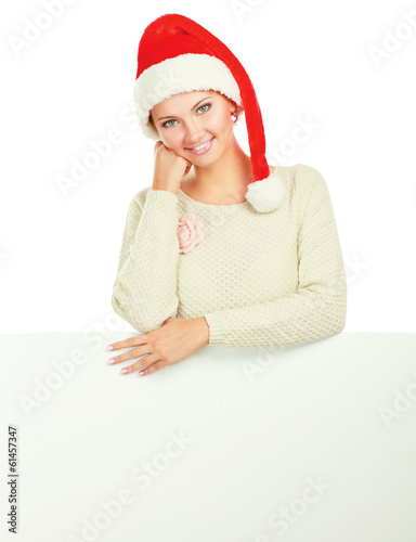Beautiful christmas woman in santa hat holding empty board.
