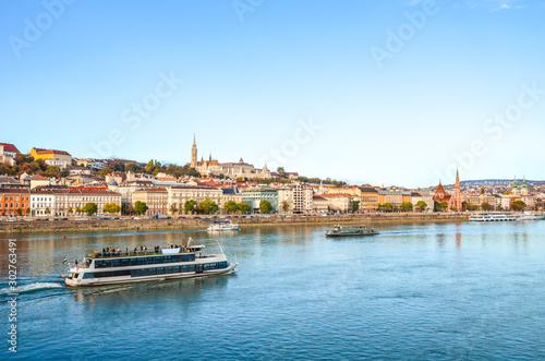 Beautiful cityscape of Budapest, Hungary. Matthias Church, Fishermans Bastion and the historical center in the background. Danube river with tourists boats in the foreground. Tourist destinations