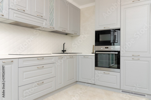 Beautiful classic kitchen in light gray, white tones in a new house.