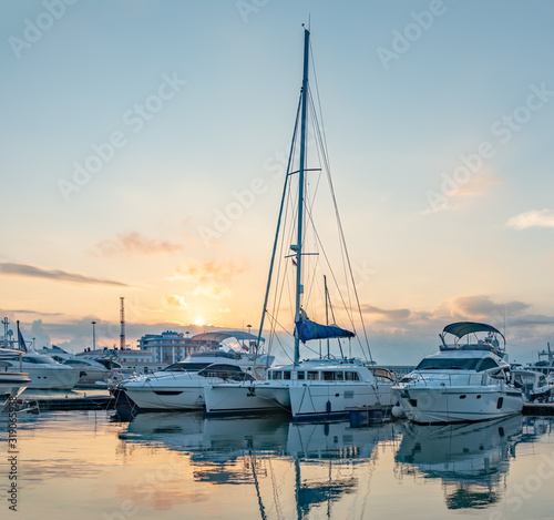 Beautiful clear sunset in the sea harbor with moored yachts.