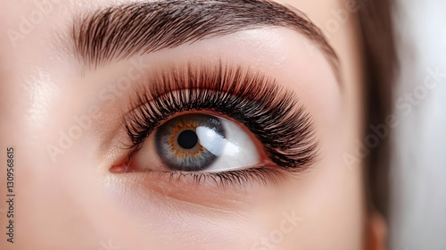 Beautiful close-up of a woman’s eye showcasing stunning eyelashes and striking blue-green iris tone with natural light
